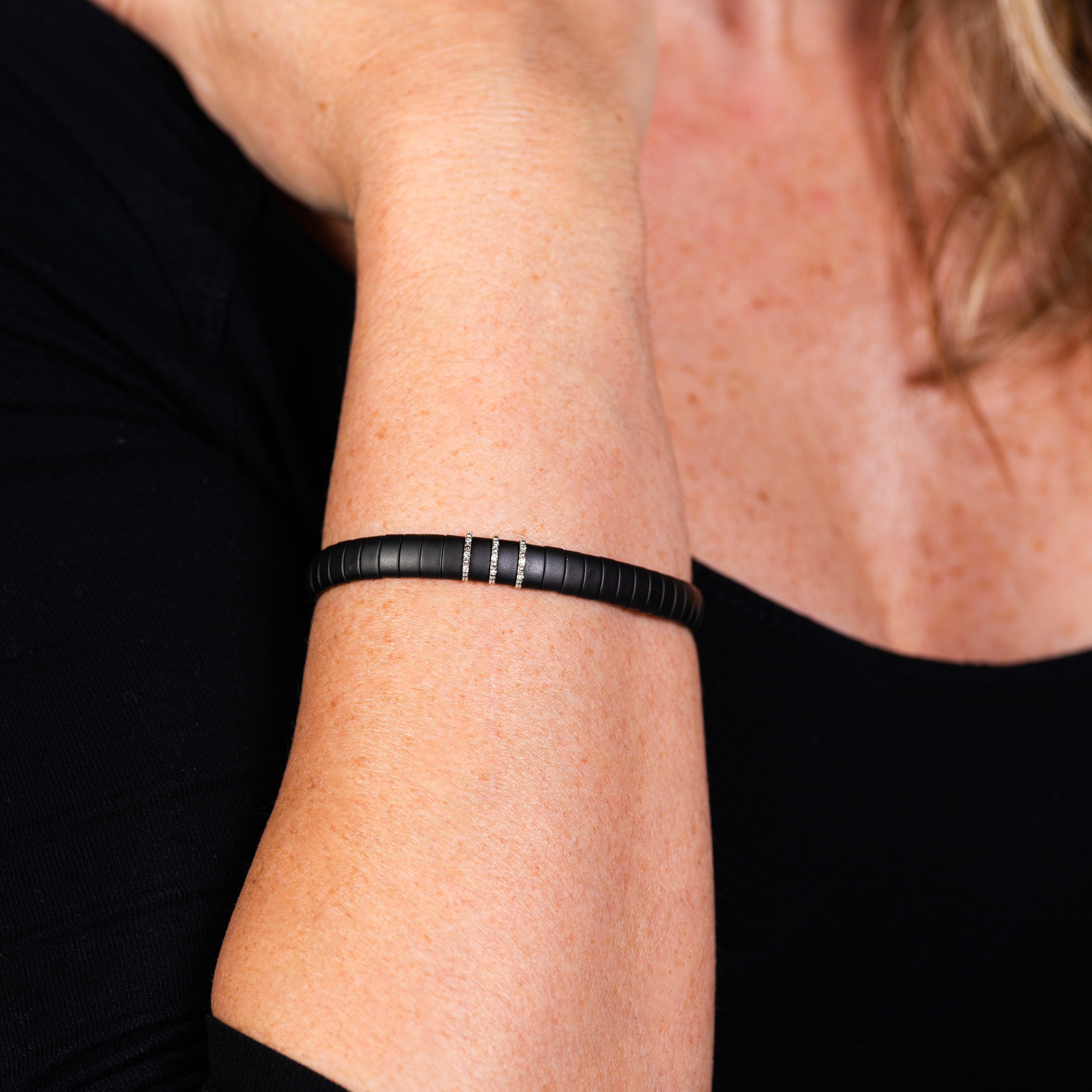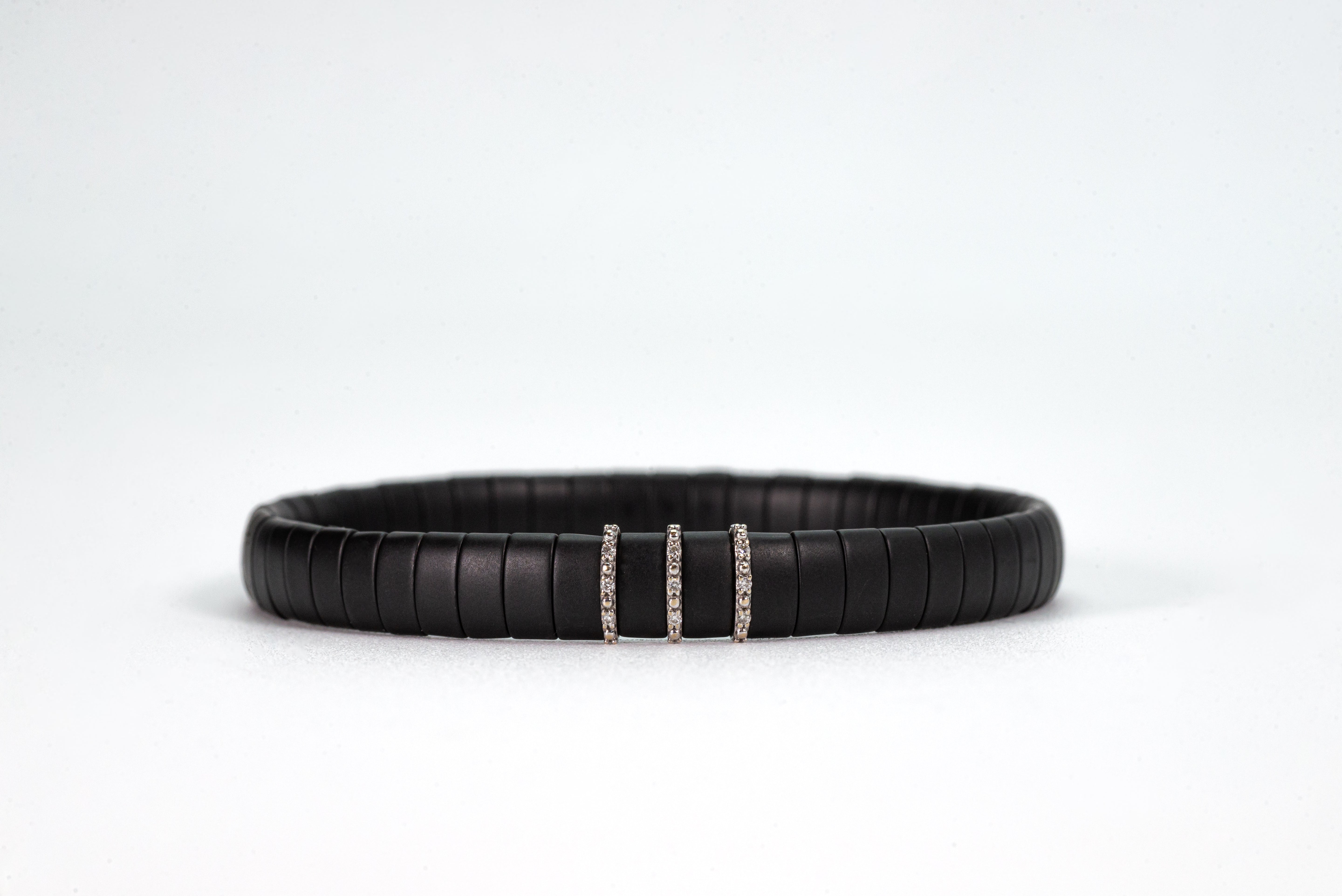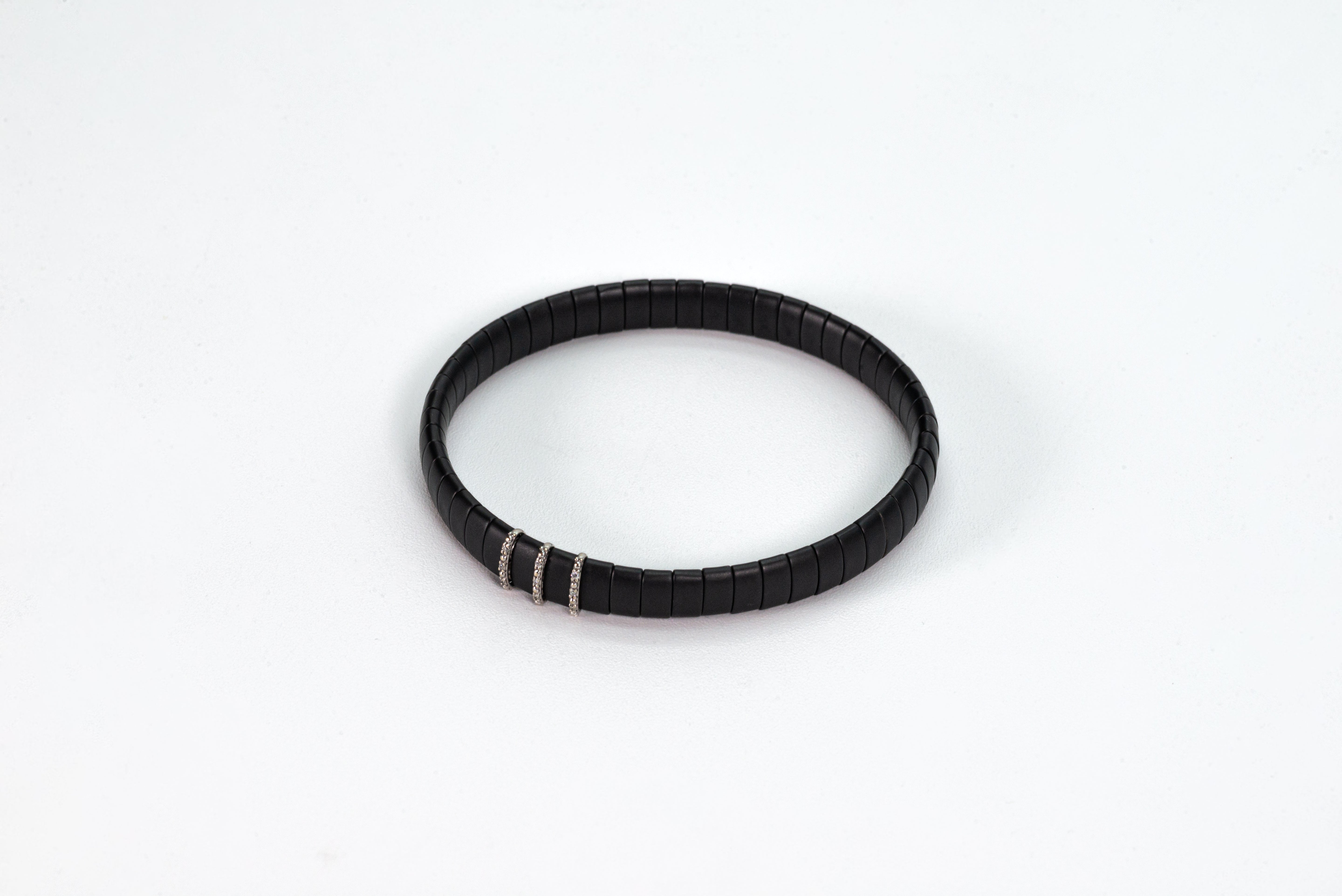 Bracciale linea “Elementi” realizzato in ceramica nera opaca con doppia molla di sicurezza in acciaio e tre listelli centrali in oro rosa e diamanti taglio brillante ct 0,04. La misura di questo bracciale è personalizzabile, in modo da aderire perfettamente al proprio polso, il design di ogni elemento è studiato per dare un ottimo comfort indossandolo.