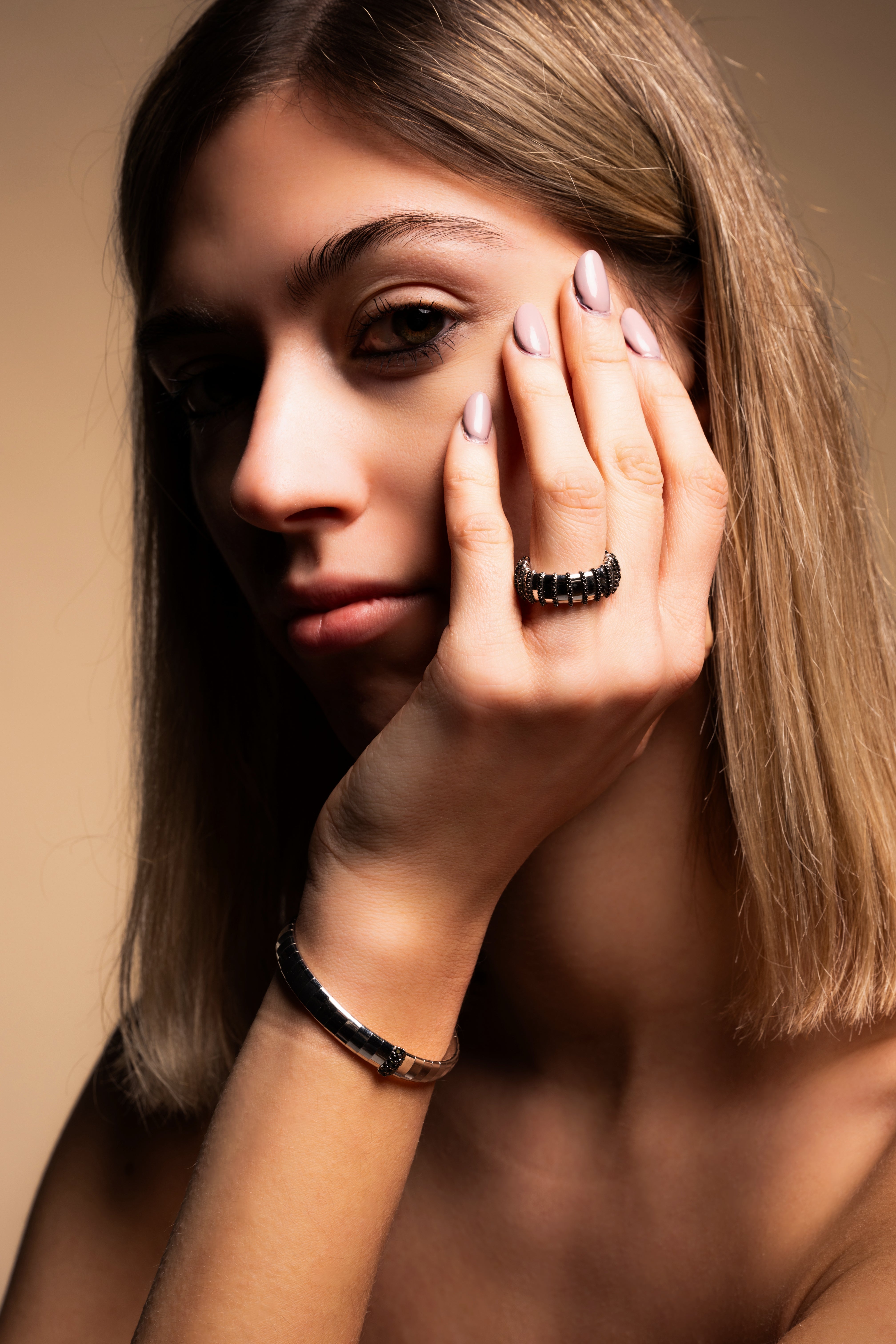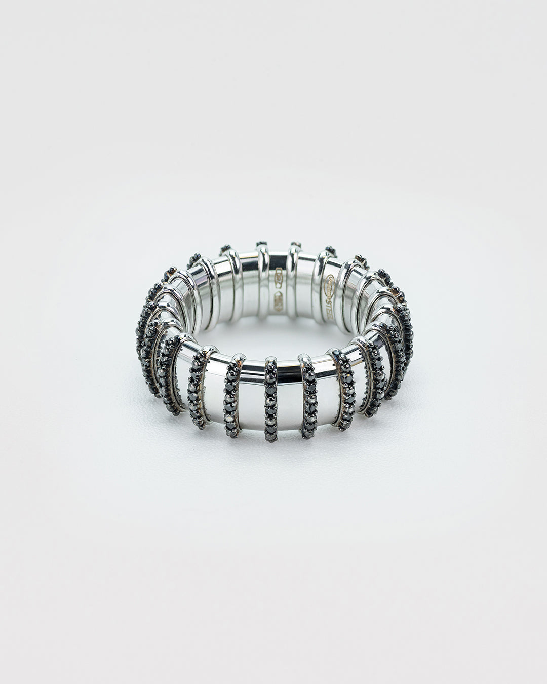 Anello linea “ELemEnT” da ct 0,35 realizzato in oro bianco 18kt lucido con doppia molla di sicurezza e listelli diamantati a 360° con diamanti black - La misura di questo anello è completamente personalizzabile, e ha una tolleranza di un paio di misure, in modo da aderire perfettamente al proprio dito; il design di ogni elemento, inoltre, è studiata per dare un ottimo comfort indossandolo.