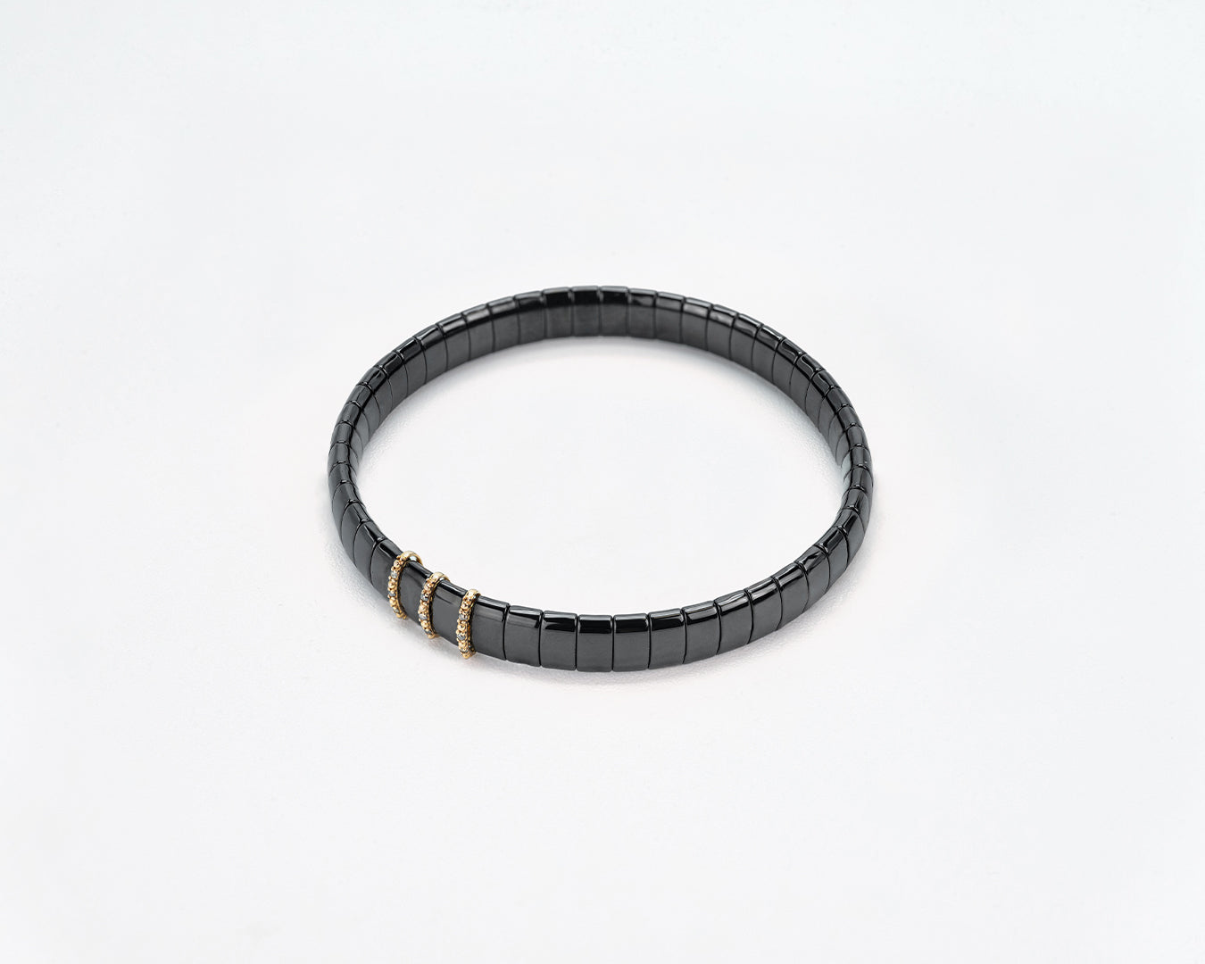 Bracciale linea “Element” realizzato in ceramica nera opaca e oro 18kt con doppia molla di sicurezza in acciaio e tre listelli centrali in oro rosa o giallo e diamanti taglio brillante ct 0,04. La misura di questo bracciale è personalizzabile, in modo da aderire perfettamente al proprio polso, il design di ogni elemento è studiato per dare un ottimo comfort indossandolo. Ti basterà quindi comunicarci la misura del tuo polso per un gioiello customizzato alla perfezione. Realizzato a mano in Italia