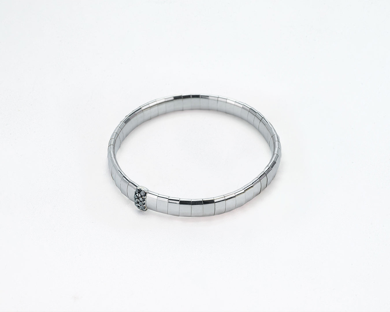 Bracciale linea “Element” realizzato in oro bianco 18kt lucido con inserto centrale doppio costituito da 2 file diamanti neri ct. 0,23 e doppia molla di sicurezza. La misura di questo bracciale è personalizzabile, in modo da aderire perfettamente al proprio polso, il design di ogni elemento è studiata per dare un ottimo comfort indossandolo. Ti basterà quindi comunicarci la misura del tuo polso per un gioiello customizzato alla perfezione. Realizzato a mano in Italia