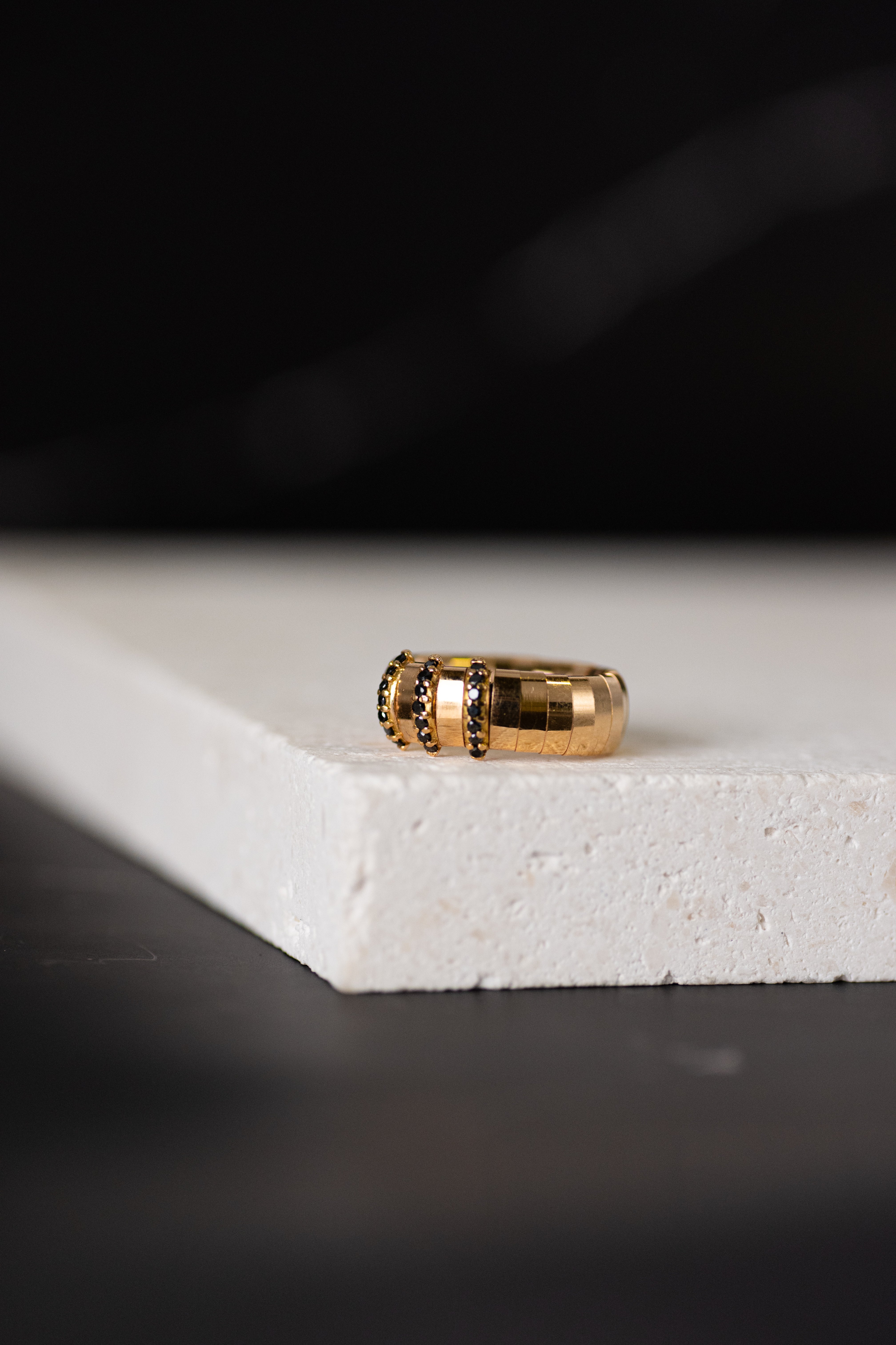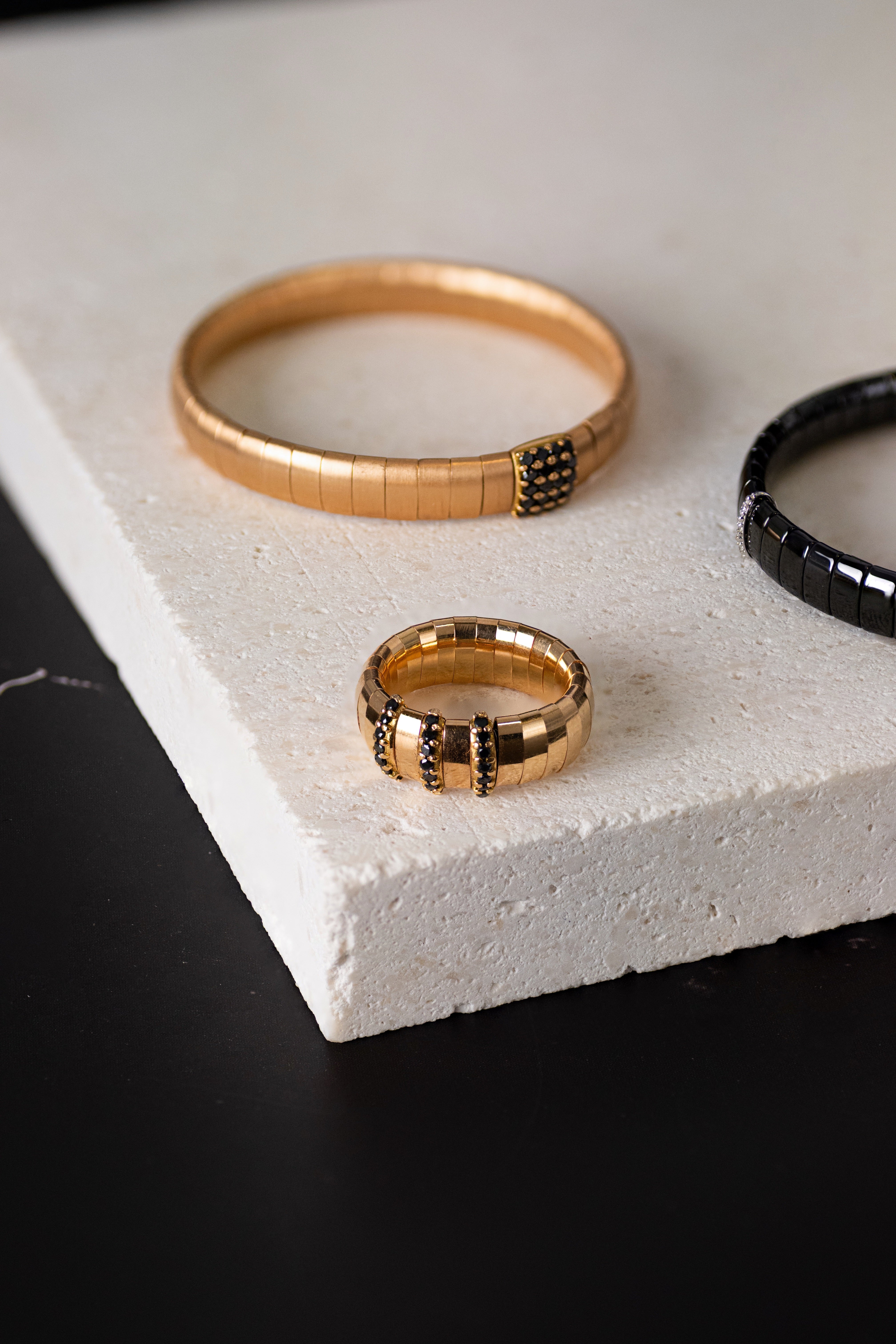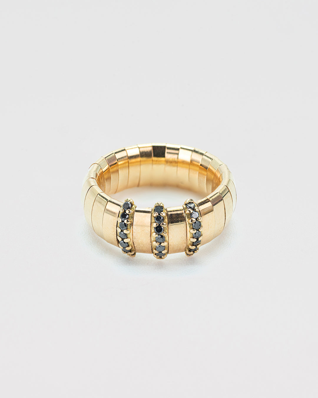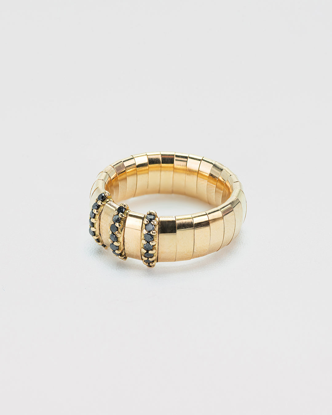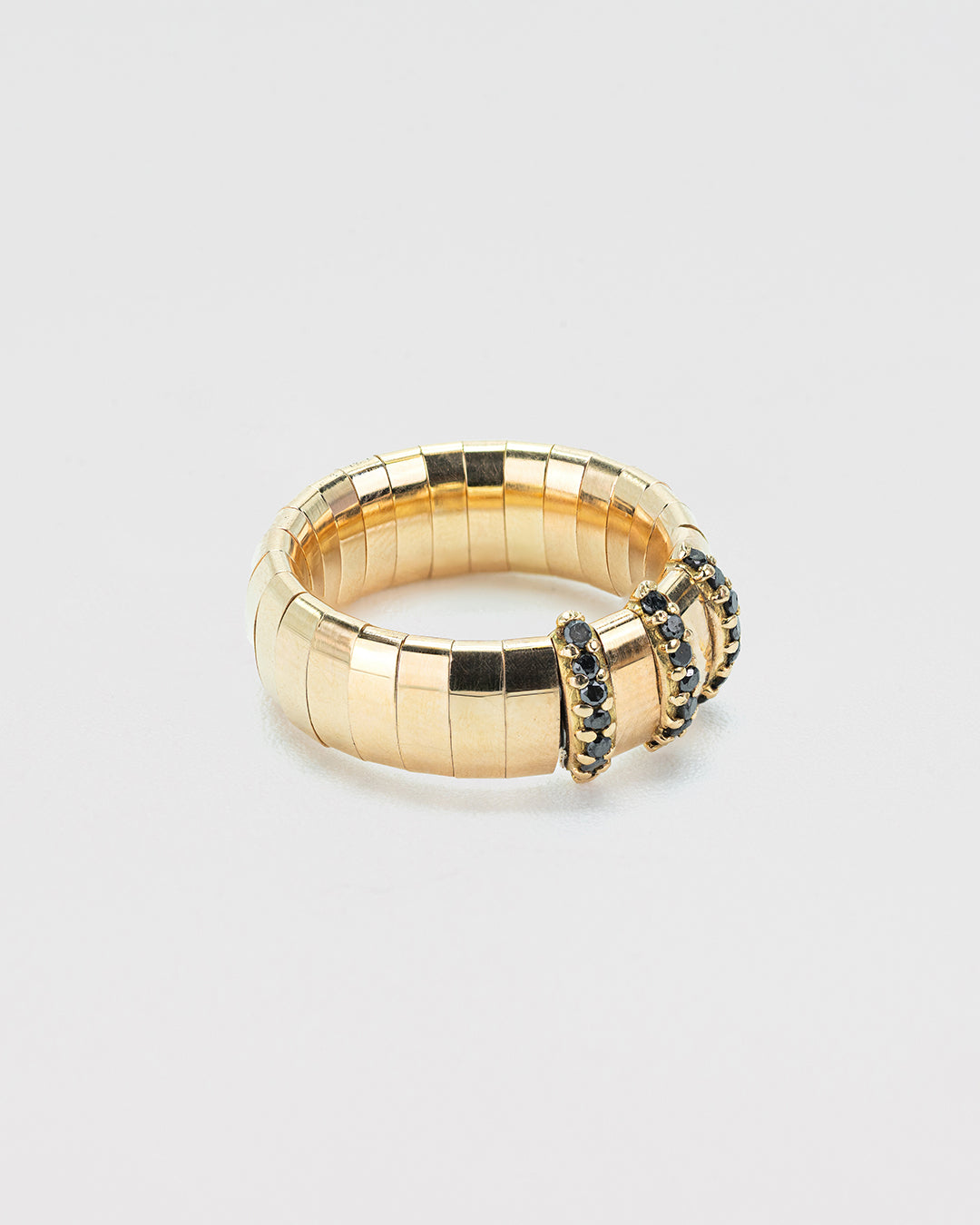 Anello linea “ELemEnT” da ct 0,28 realizzato in oro giallo 18k satinato con doppia molla di sicurezza e tre file di listelli diamantat black per parte - La misura di questo anello è completamente personalizzabile, e ha una tolleranza di un paio di misure, in modo da aderire perfettamente al proprio dito; il design di ogni elemento, inoltre, è studiata per dare un ottimo comfort indossandolo.