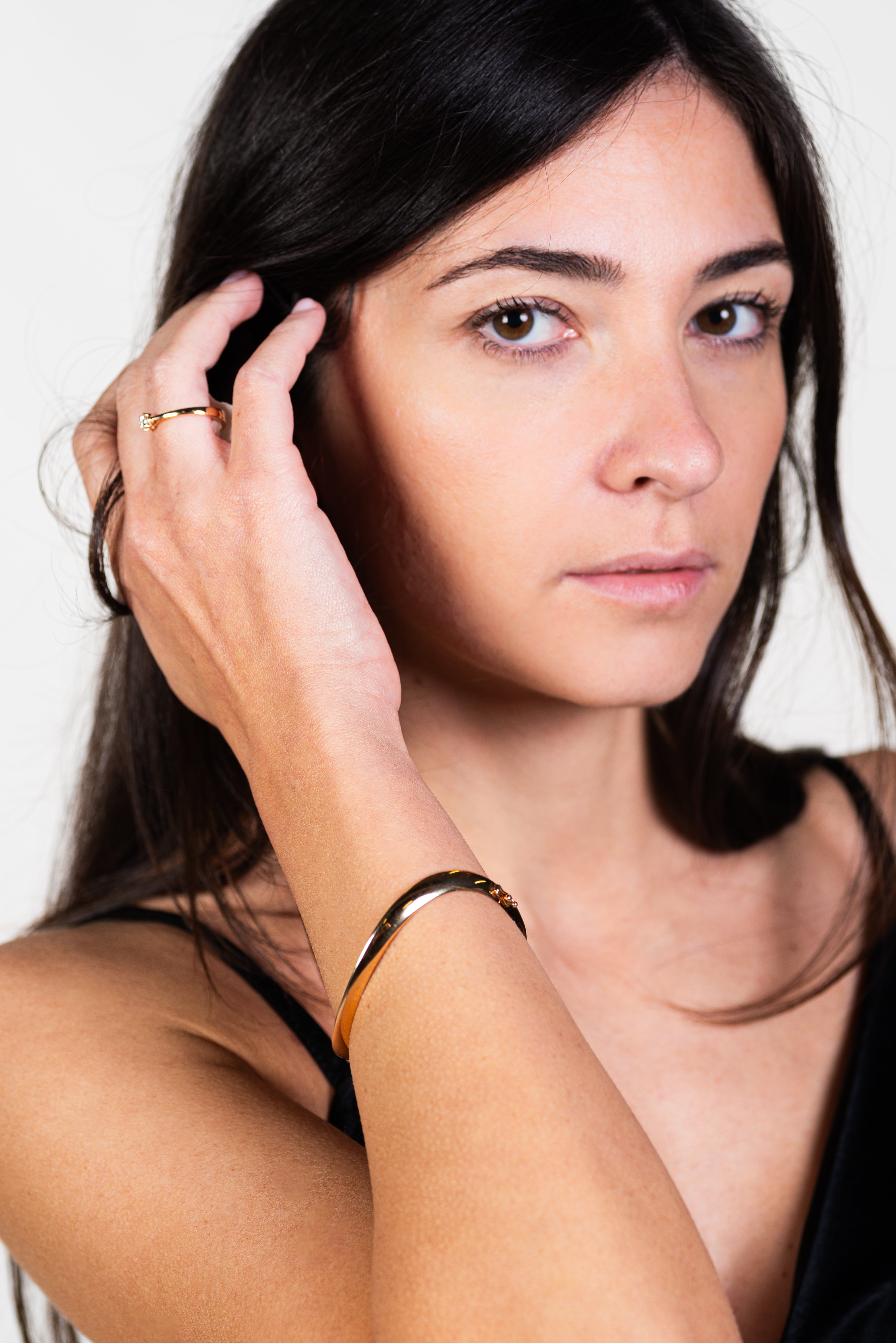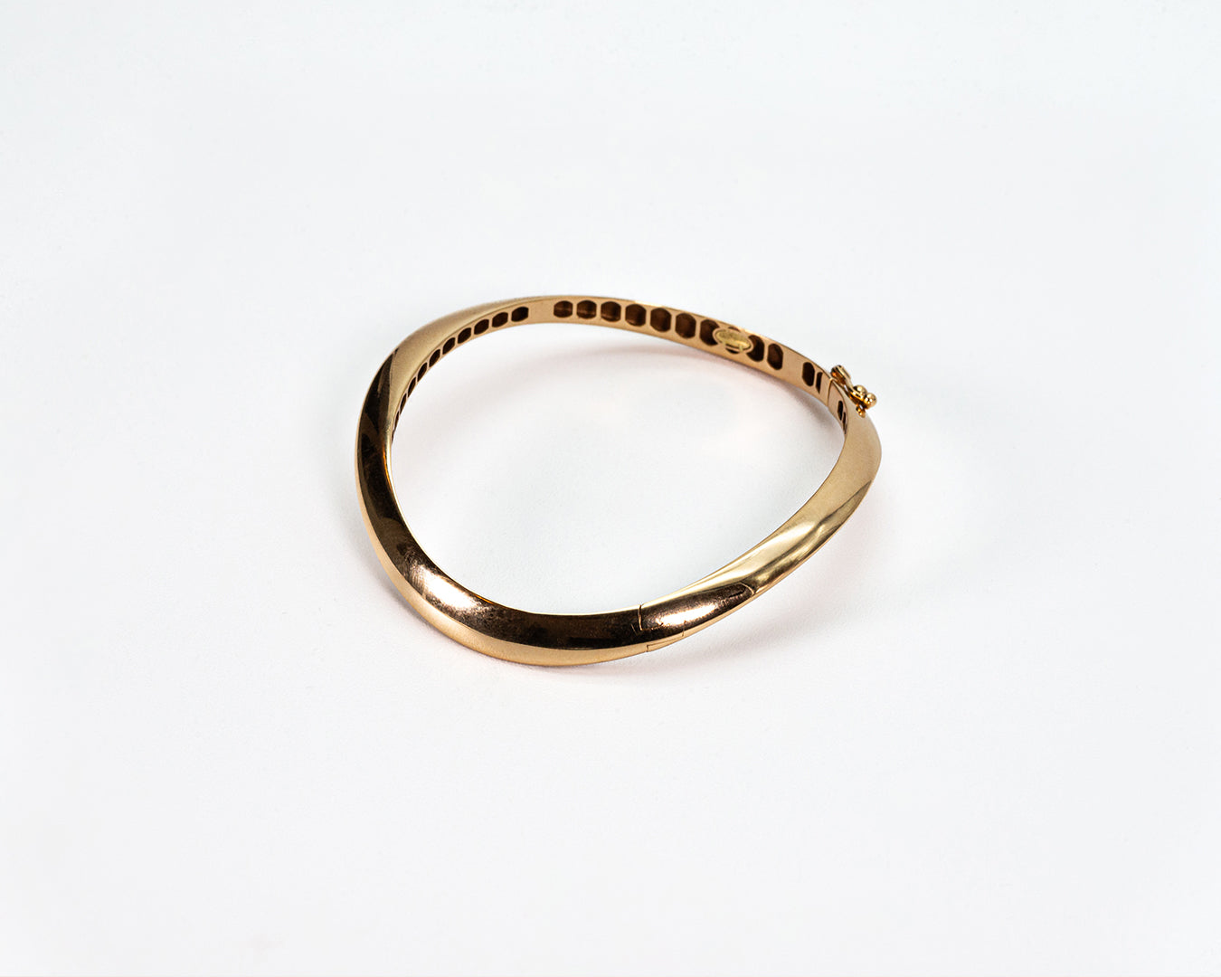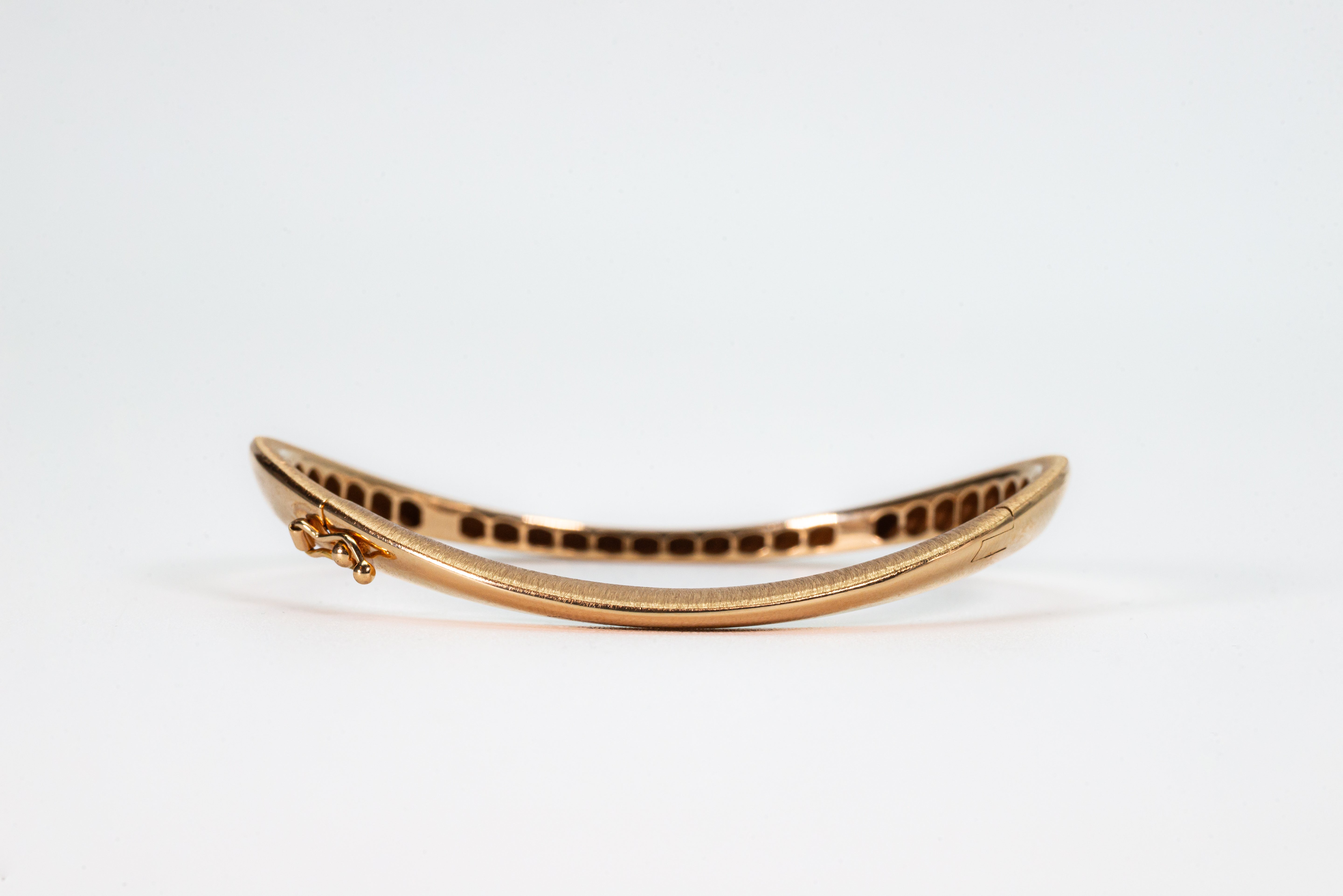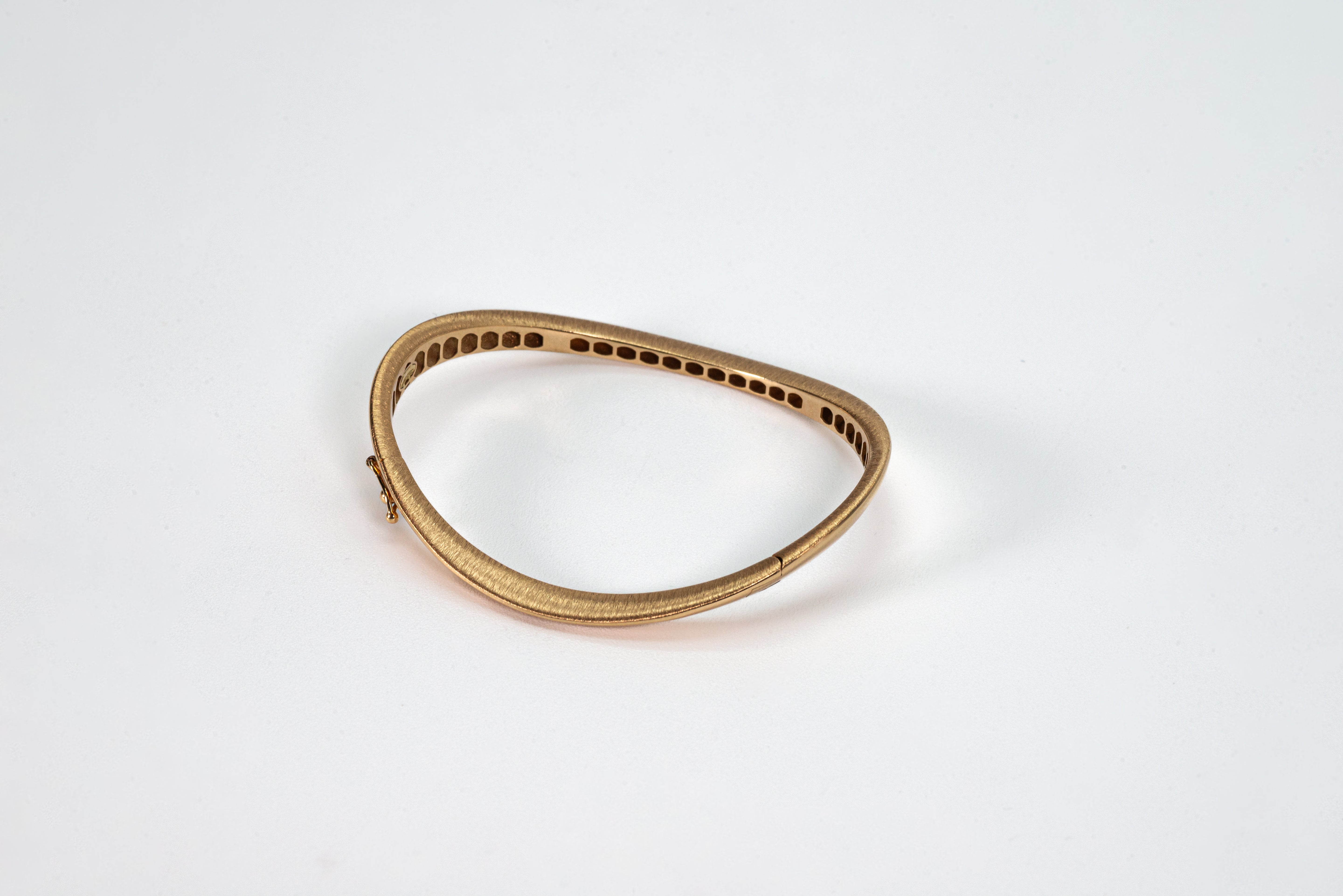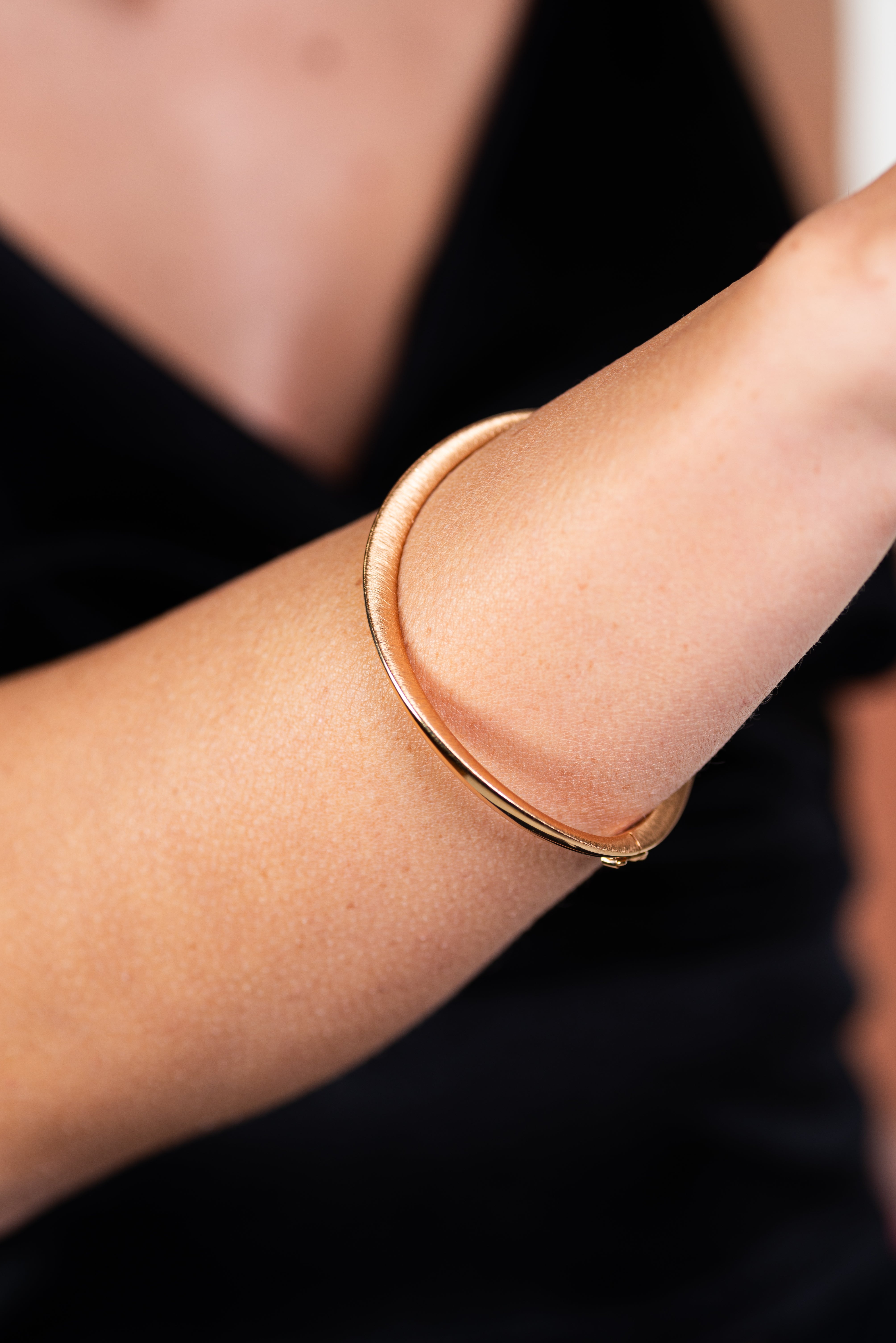 Bracciale in oro rosa 18 kt con doppia lavorazione: liscio da un lato e tramite seppiato a mano dall’altro. Realizzato a mano in Italia ha una linea sinuosa che slancia il polso (gr 10,9)