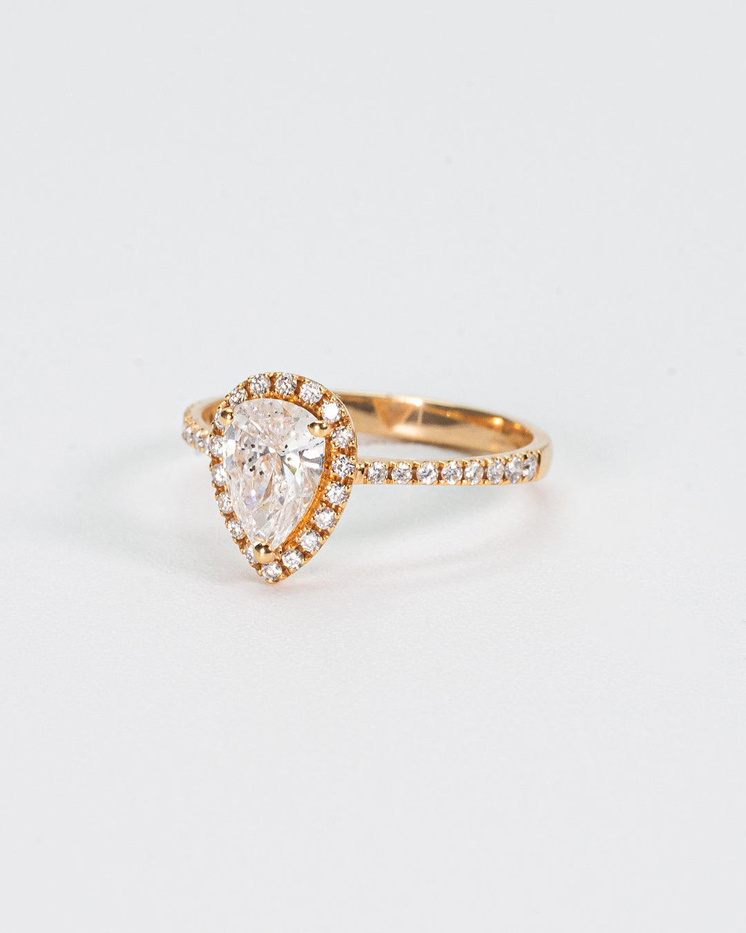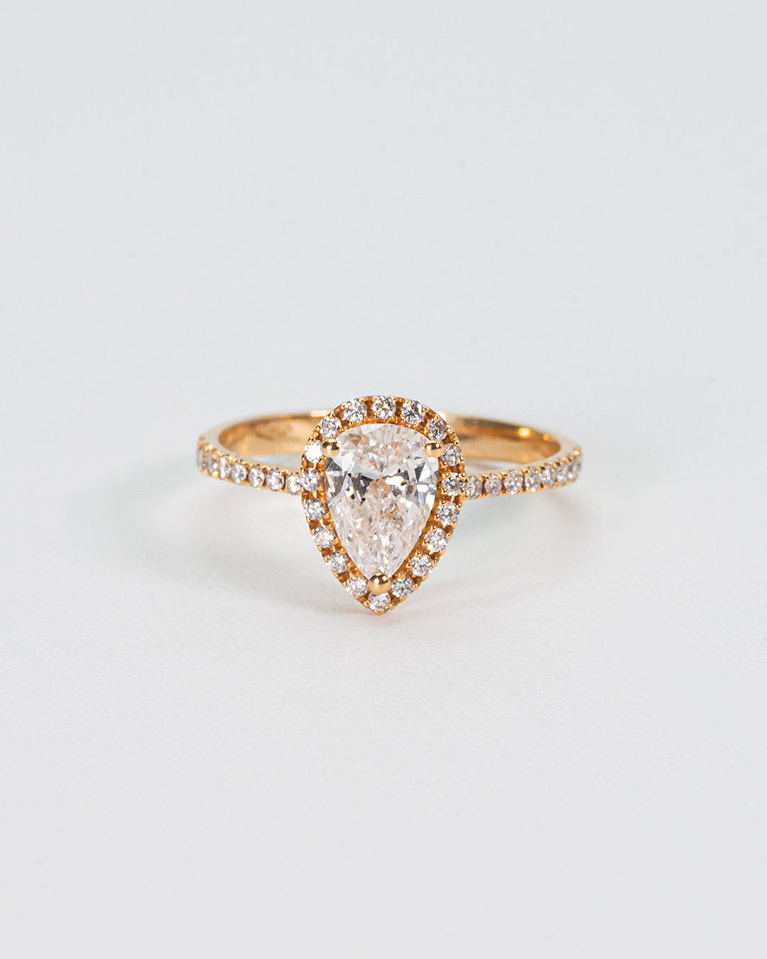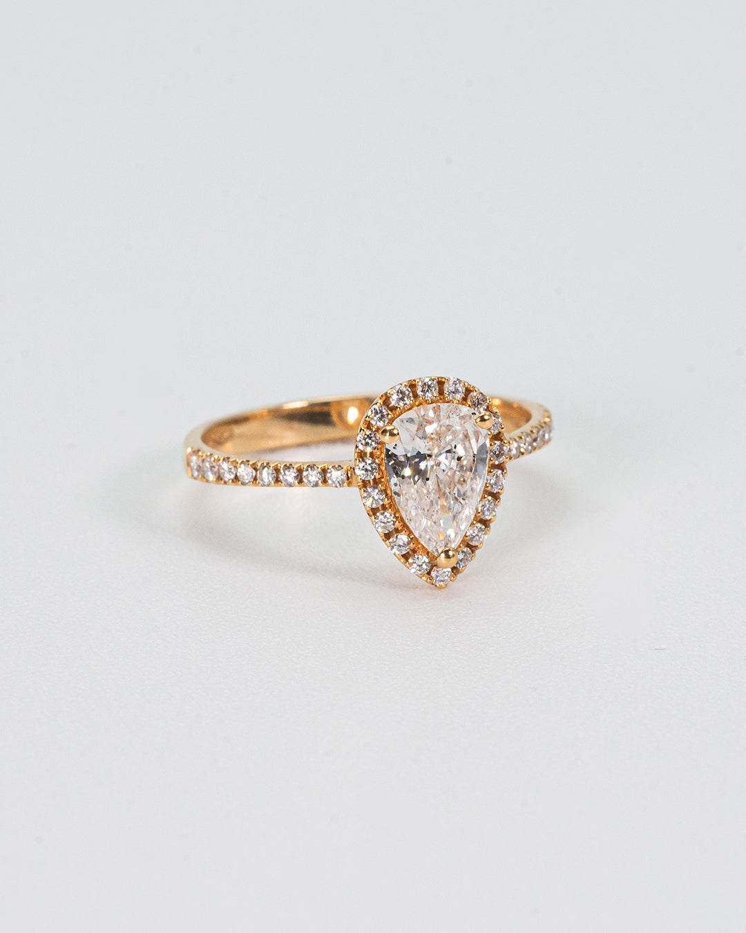 Anello solitario con taglio a goccia da ct 0,81 contornato da un corona di diamanti taglio brillante incastonati su un gambo sottil anch’esso tempestato di diamanti montati a griffe per ct 0,72 F VS .