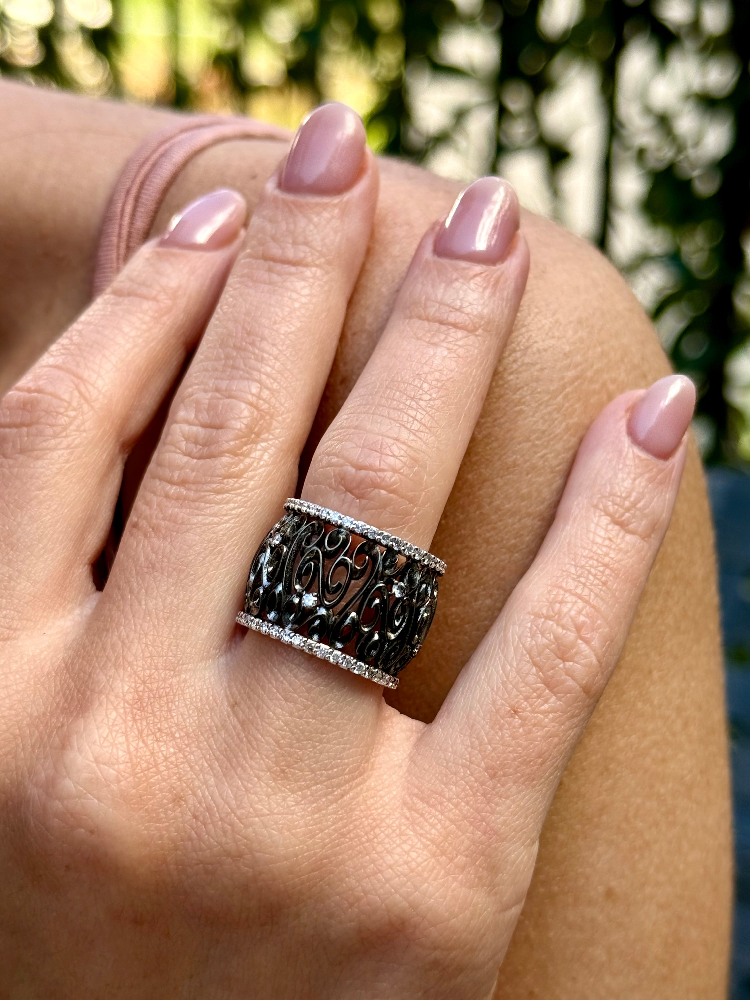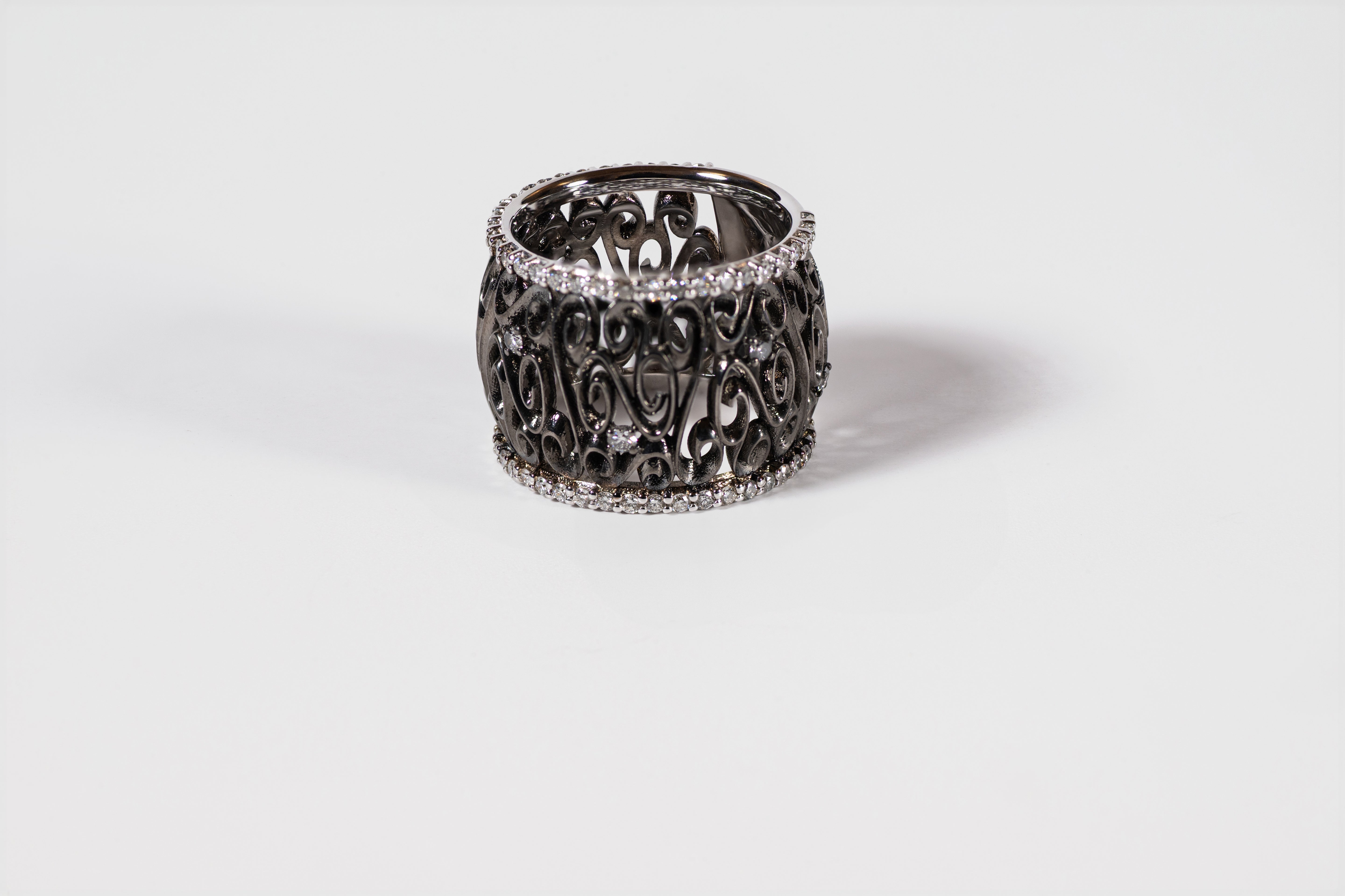 L'Anello Moresca è un gioiello unico in oro 18kt bianco e ceramica nera, impreziosito da 0,81 ct di diamanti. Il suo design si ispira alle costruzioni moresche del 15esimo secolo, conferendogli un'eleganza senza tempo. Con i suoi 9,90gr di oro 18kt, questo anello è un simbolo di classe e bellezza. Dotato di luce e grazia, sarà un'aggiunta preziosa al tuo look.