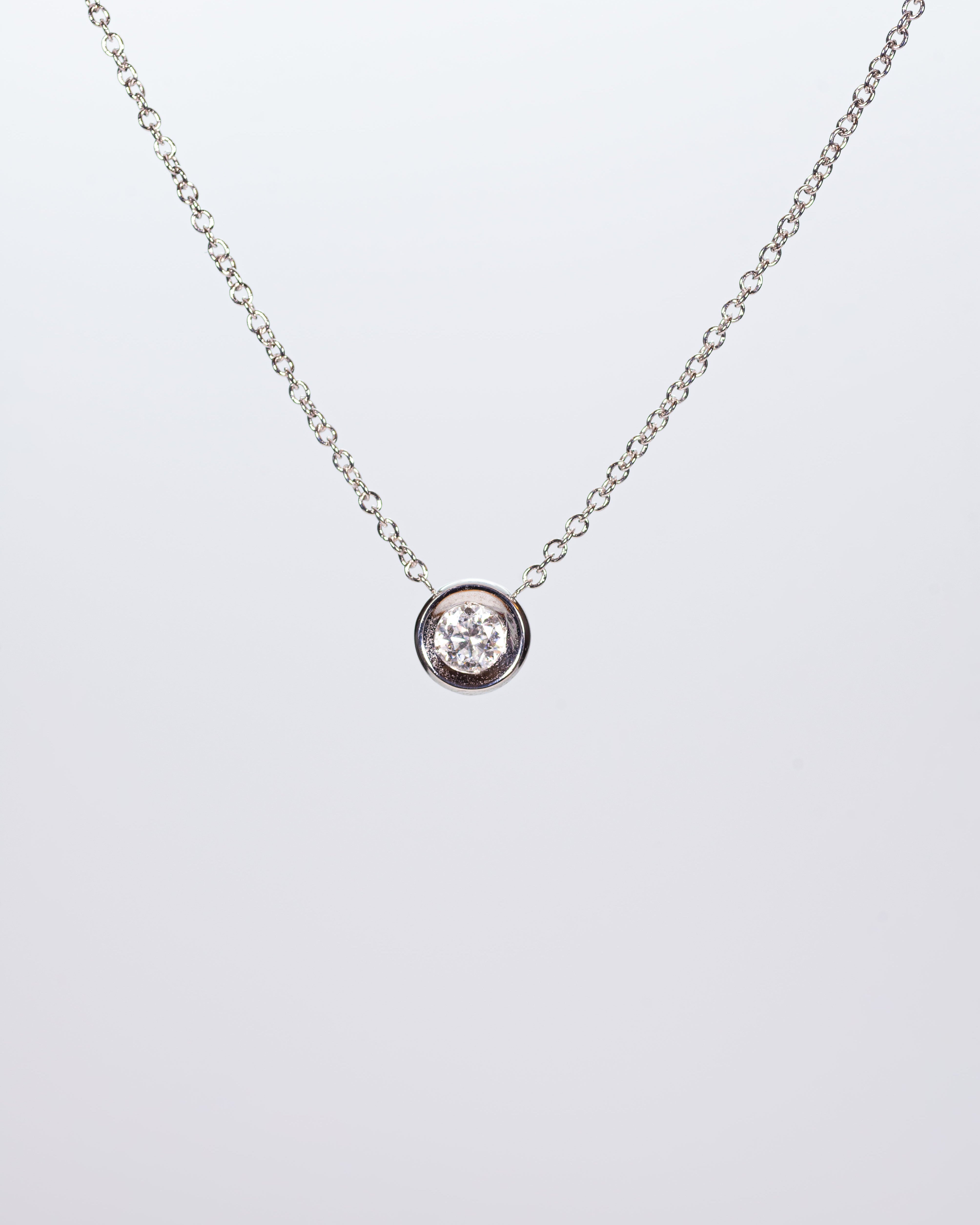 Punto luce in oro bianco 18kt. Questa collana con ciondolo solitario centrale è realizzata con un attento studio del castone che conserva il diamante: il suo particolare grado di curvatura, infatti, riesce a fare brillare il diamante D color incastonato al suo massimo, in questa versione la pietra si presenta fissa al centro di una collana rolò; inoltre, grazie alla creazione di fessure laterali e posteriori, da alla luce la possibilità di insinuarsi a 360° rendendo unico l’effetto “luce” di questo gioiello che nella sua semplicità non teme confronti rappresentando un must have per ogni donna.