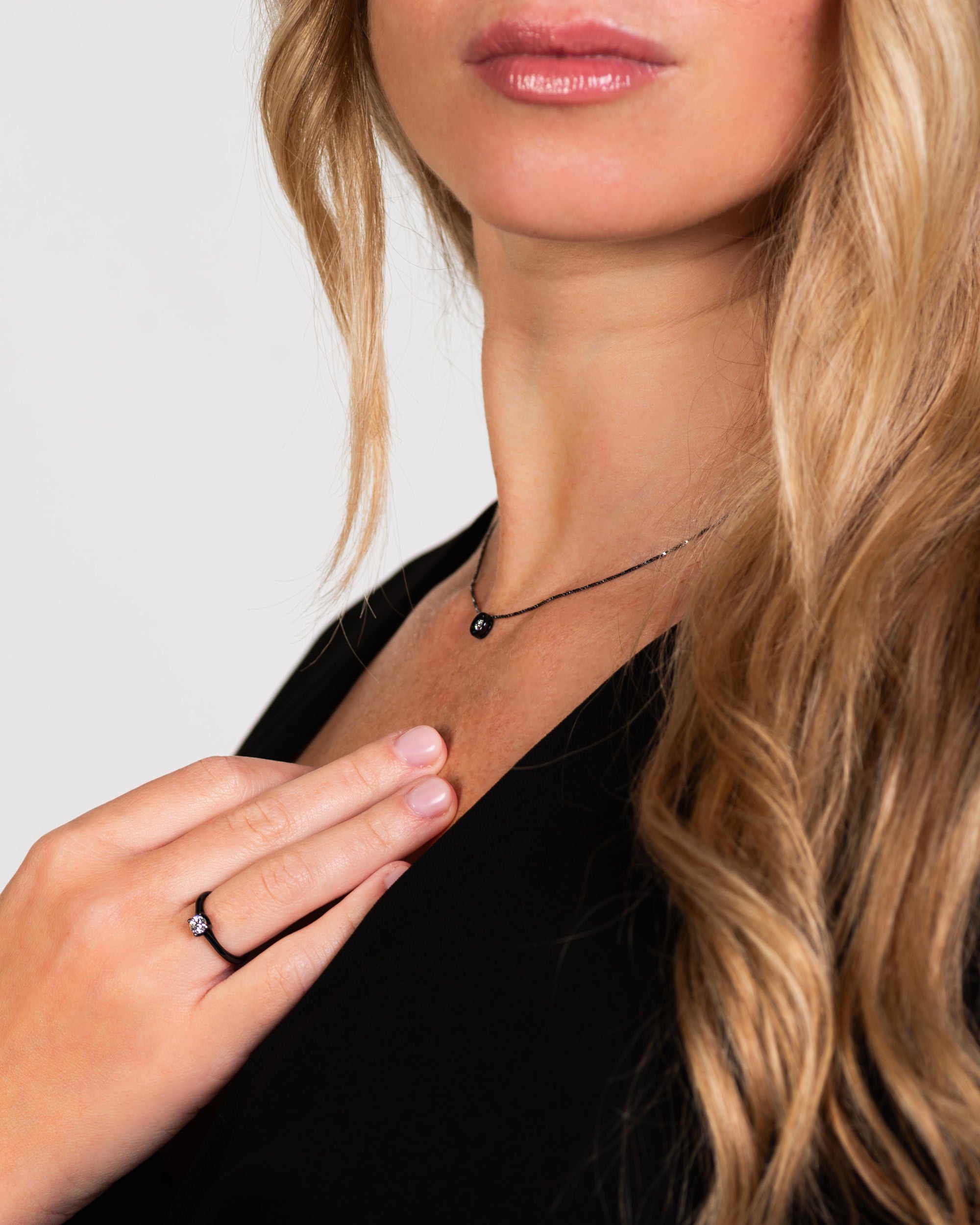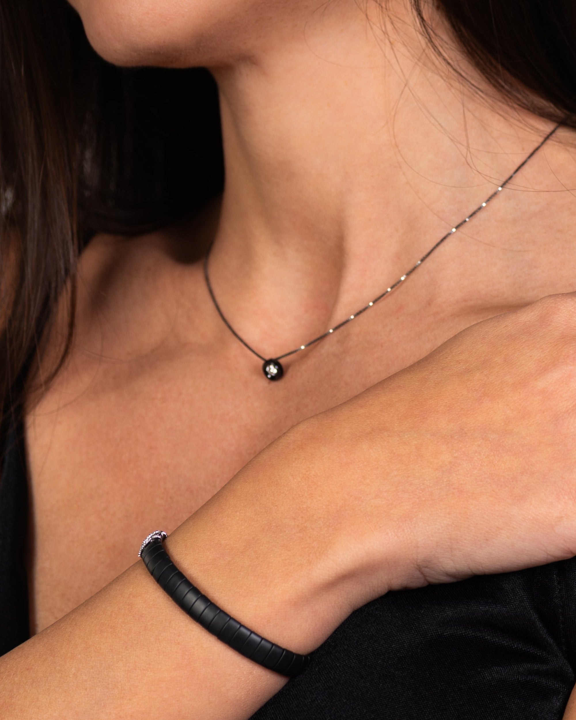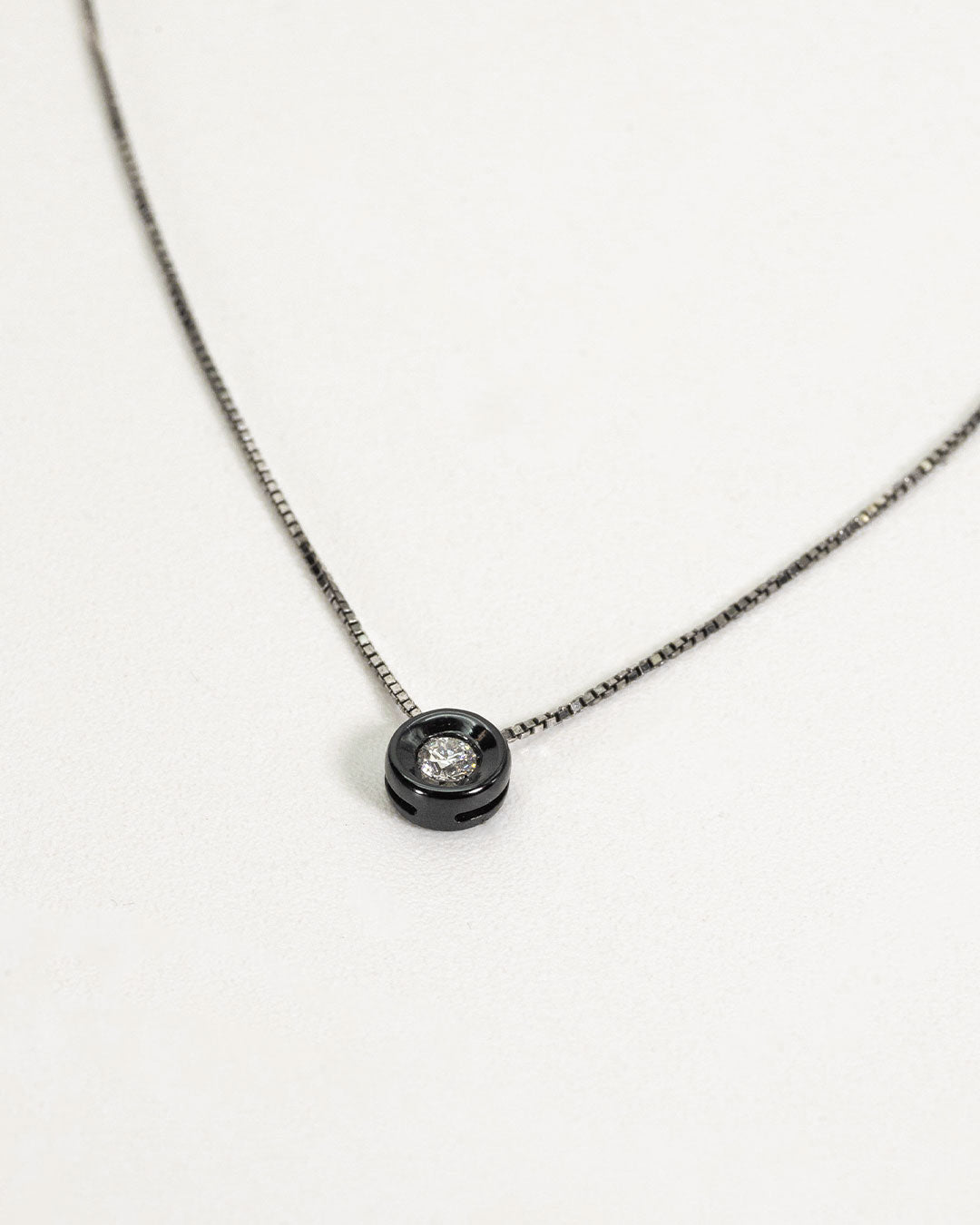 questa collana, realizzata in nano ceramica cotaing con un diamante puro al centro, esce dagli schemi della gioielleria tradizionale affiancando al colore nero lucido la purezza assoluta di un diamante incolore D color. Inoltre, il castone che tiene il diamante è studiato con un grado di curvatura perfetto per risaltare al meglio la bellezza di questa pietra.
