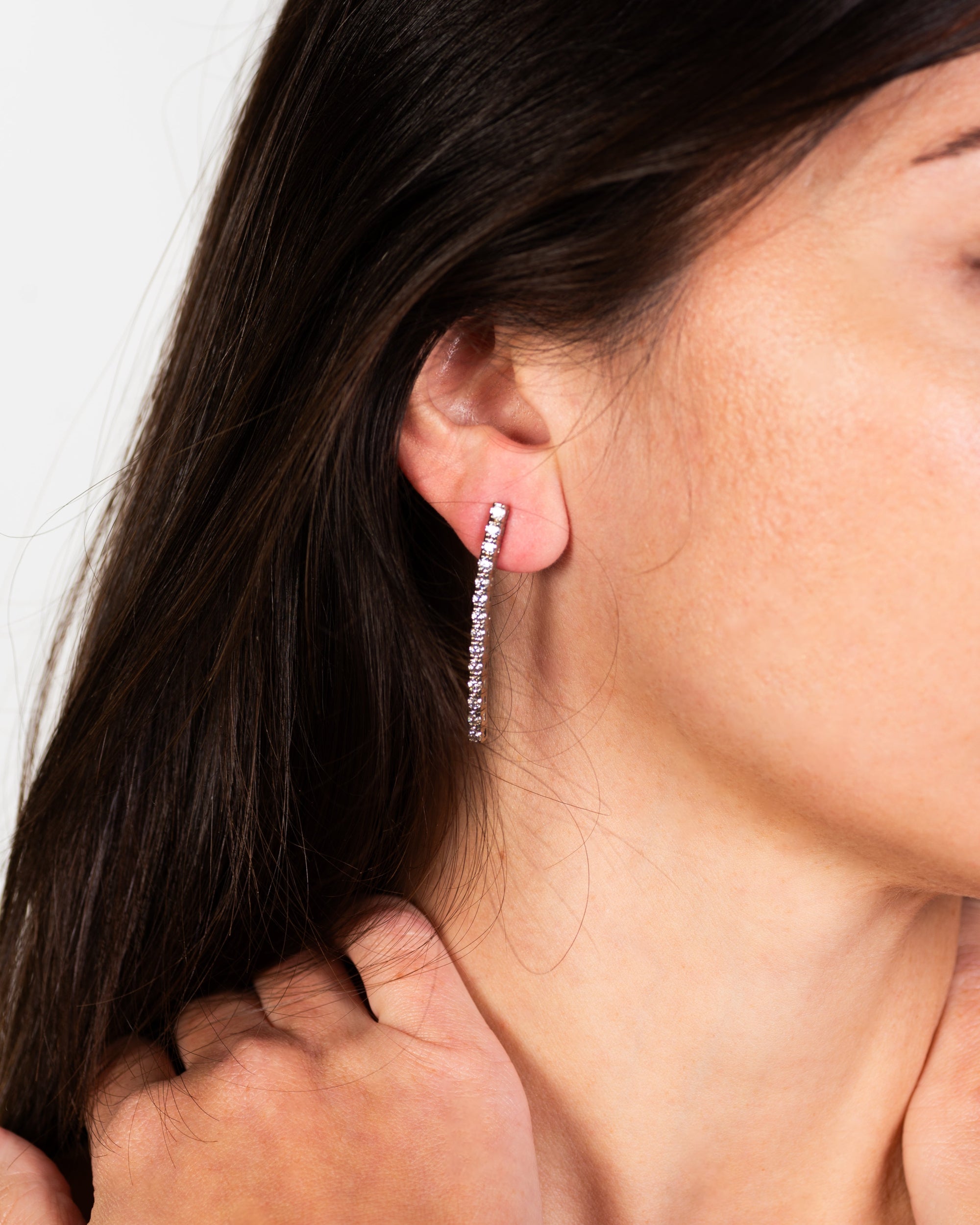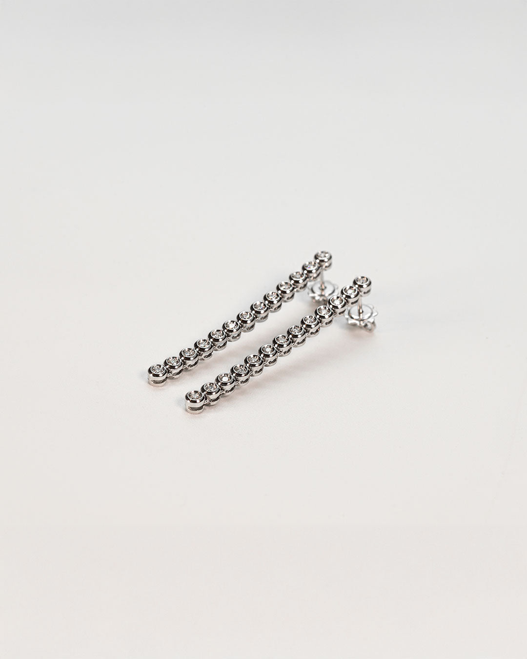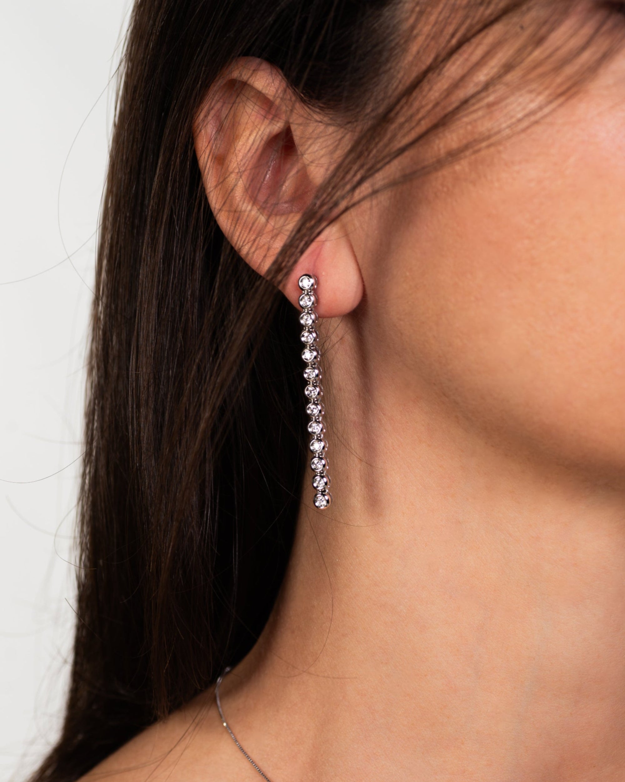 Orecchini realizzati in oro bianco 18 carati, questi orecchini pendenti con montatura morbida a castoni con diamanti è perfetta per un grande evento in cui regna l’eleganza. I 26 diamanti da cui sono composti scendono paralleli al collo seguendo ogni movimento con naturalezza e fascino.