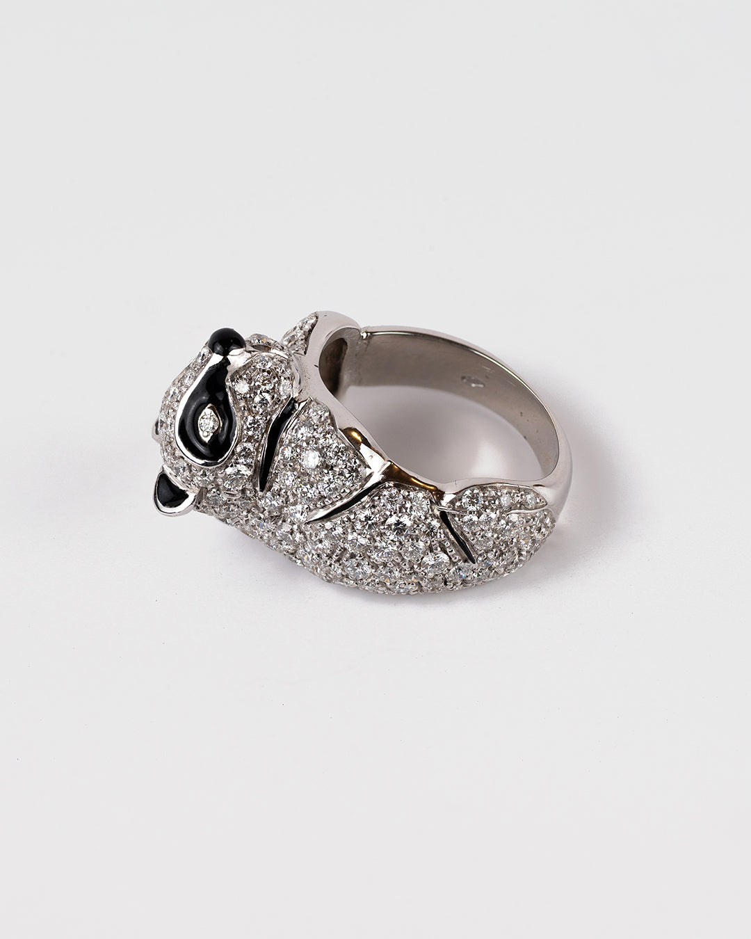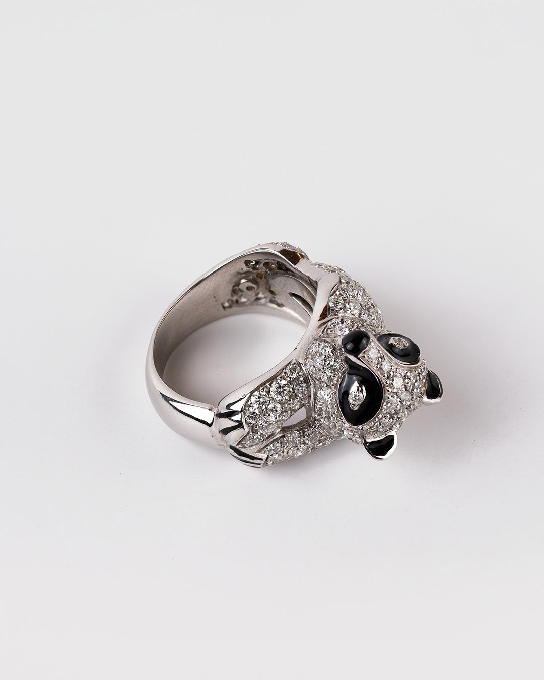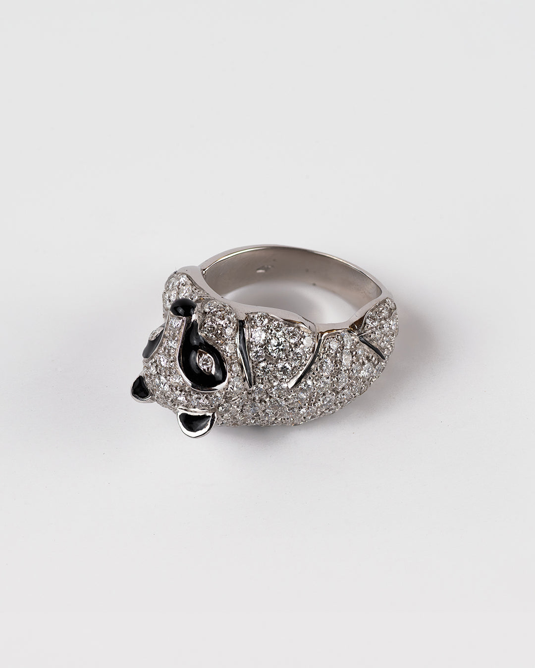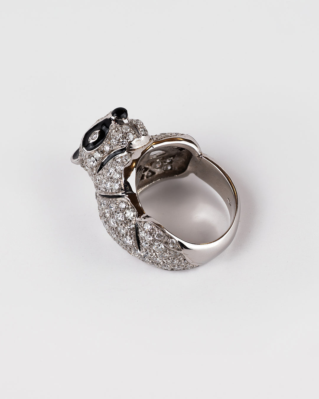 Anelllo in oro bianco 18 kt, smalto nero e diamanti della linea “Animals” realizzato su richiesta raffigurante un orsetto lavatore studiato in ogni suo dettaglio.